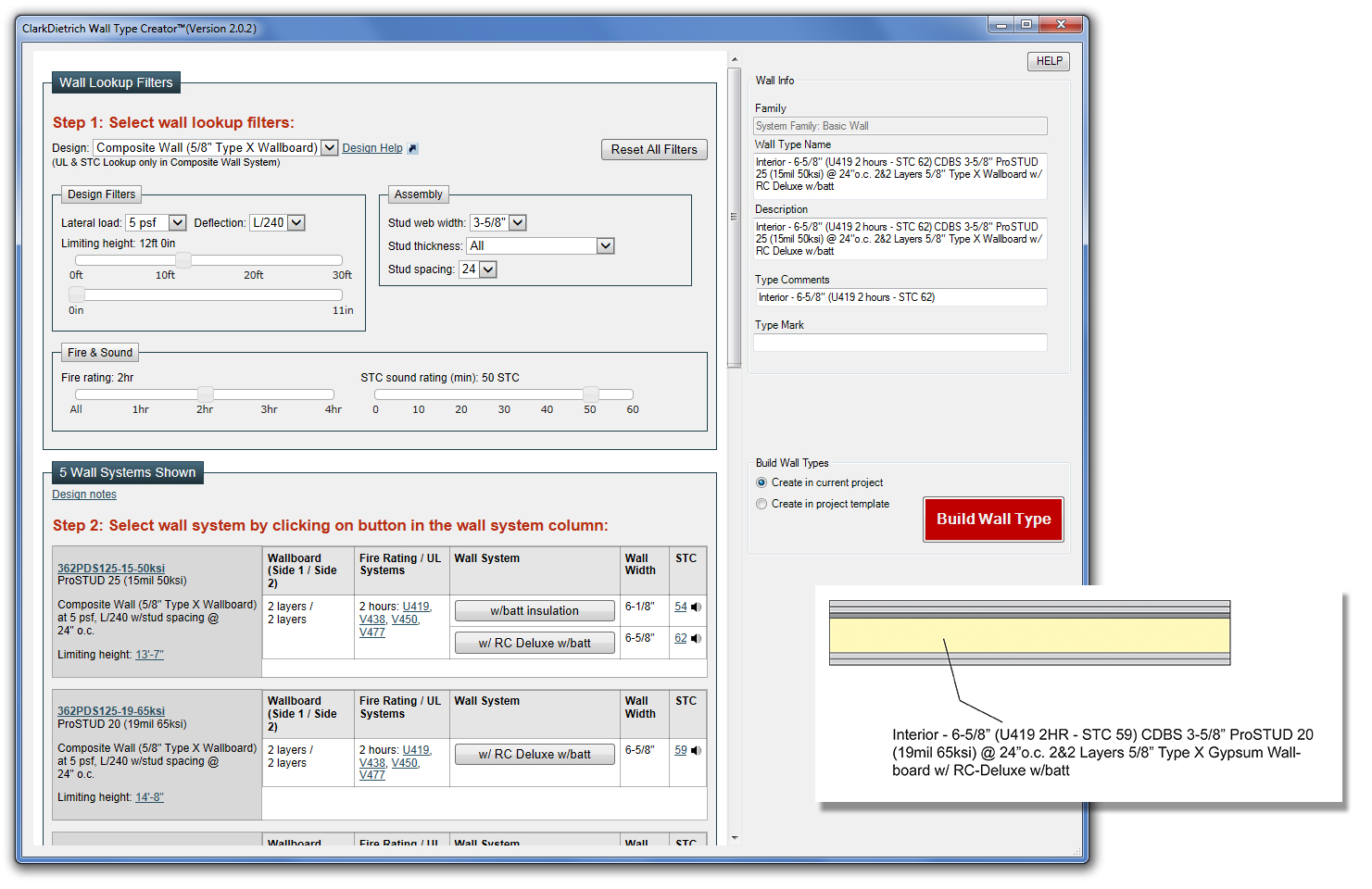 Initially launched in 2011, the latest version of Wall Type Creator features a complete redesign using the ClarkDietrich iProSTUD.com interface system, allowing users to see all system results and filter information by design, assembly, fire rating or STC sound rating. Wall Type Creator also includes more than 75 sound tests and STC simulated tones to help reference frequency differences between various STC ratings.
