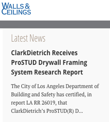 Walls & Ceilings web link: Latest Headlines: ClarkDietrich Receives ProSTUD Drywall Framing System Research Report