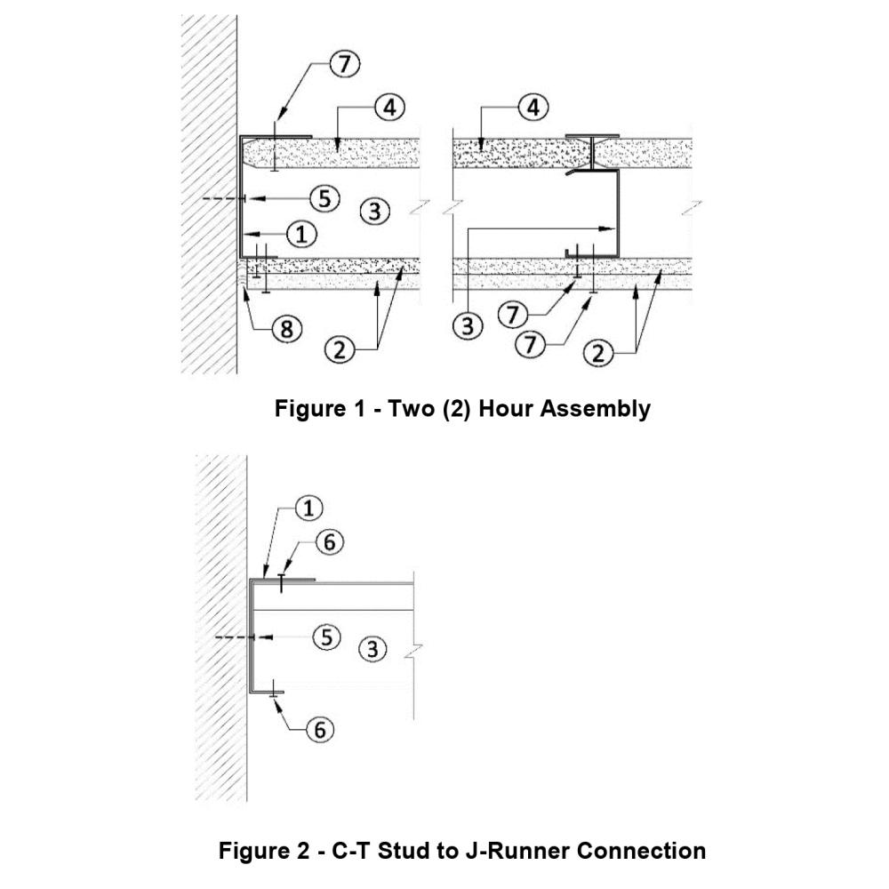 - For a two-hour assembly two layers of 1/2" Type C or 5/8" Type X gypsum board (Item ②) should be installed at right angles to the framing members. Install the inner layer with #6 (Item ⑦) x 1" Type S drywall screws, 24" o.c., starting 3" maximum from the ends of the C-T studs. Butt joint of adjacent panels should be centered on a stud flange. Install the outer layer of 1/2" Type C or 5/8" Type X gypsum board with #6 (Item ⑦) x 1-5/8” Type S drywall screws, 12" o.c. in the field and at the perimeter. Offset the board joints a minimum of one stud spacing (24”) between layers.