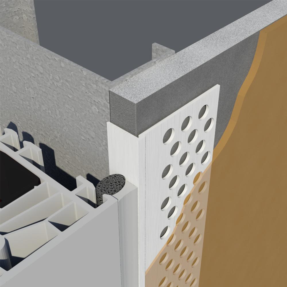 Designed to protect the raw edges of the board in Direct-Applied Exterior Finish Systems (DEFS). Two rows of large perforations allow the base coat mixture to easily flow through and bond to the substrate. Weep holes provide drainage away from the substrate. ClarkDietrich Keylock™ Splice connectors are available for alignment and as a base for sealant. Caulk all intersections, butt joints, ends, and corners at the time of installation