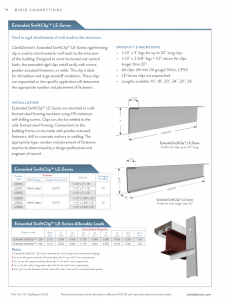 Extended SwiftClip™ LE-Series are attached to cold-formed steel framing members using #10 minimum selfdrilling screws. Clips can also be welded to the cold-formed steel framing. Connections to the building frame can be made with powder-actuated fasteners, drill-in concrete anchors or welding. The appropriate type, number and placement of fasteners need to be determined by a design professional and engineer of record.