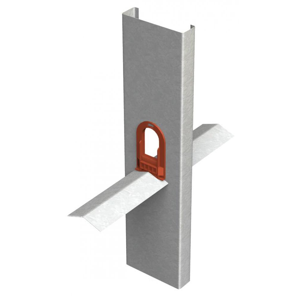 The TradeReady Spazzer 5400 bar is passed through the stud knockouts and rotated 90° into position, engaging each side of the knockout. For 20 gauge studs, the Spazzer snap-in grommet requires screws to keep the bar in place. The TradeReady Spazzer 5400 bar should be installed at maximum 5' o.c. vertically or per specification, and should not be used in studs over 6" wide.