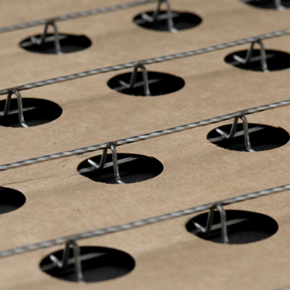 V Truss for Walls & Ceilings combines a series of 3/8-inch 'V' shaped trusses, and heavy perforated draft paper that is sandwiched between the primary sheet and back layer of stiffening wires. The sheets are lightweight, yet strong and easy to cut. Attachment points are identified on the printed kraft paper for ease of installation.